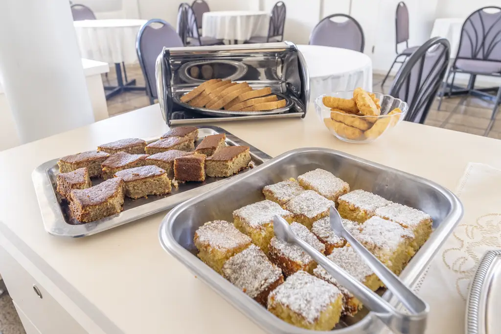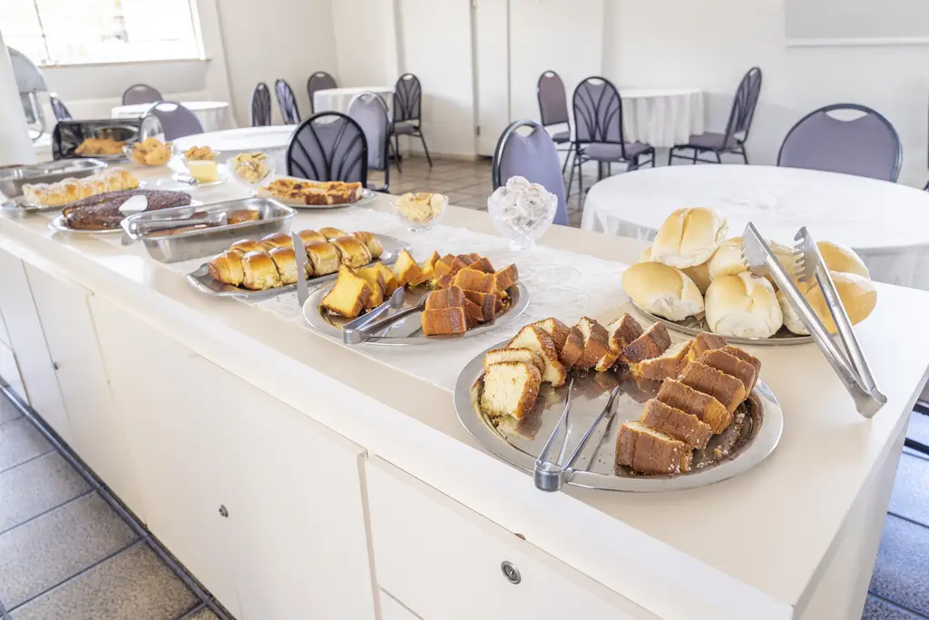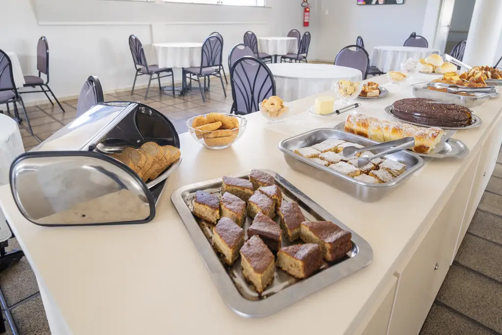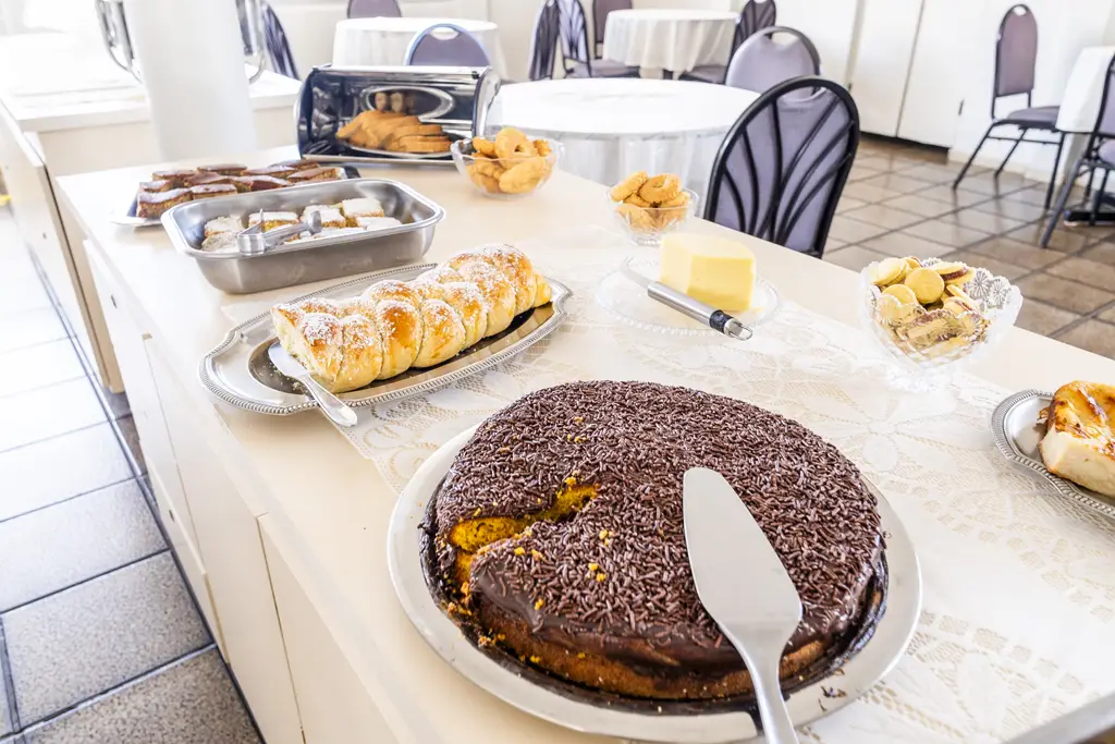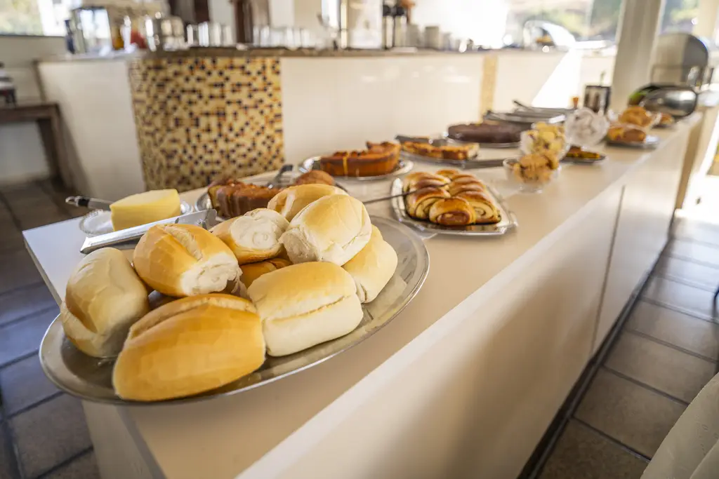 Um café da manhã colonial completo, com variedade de pães, frutas, bolos e quitandas regionais para começar o dia com energia e sabor.O Hotel Nacional oferece um café da manhã colonial variado, com pães, frutas, bolos, sucos e quitandas regionais. Uma refeição preparada para proporcionar energia e bem-estar, valorizando a gastronomia local e tornando suas manhãs ainda mais agradáveis.